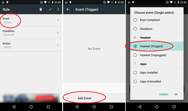 3. Toque na opção “Event”, depois em “+ Add Event” e selecione o evento “Headset (Plugged)”.