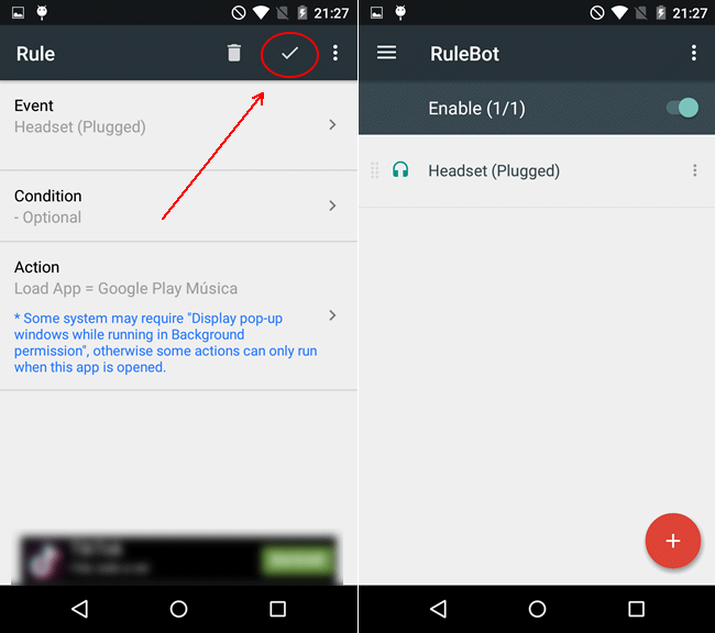 6. Retorne a tela anterior e salve a regra criada. Uma vez feito isso, sempre que você conectar o fone de ouvido no smartphone, ele irá abrir automaticamente o aplicativo de música selecionado.