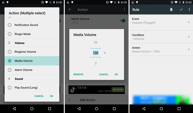 Bônus: Você também pode criar uma outra regra para ajustar o volume ao conectar o fone. Para isso, selecione o evento “Headset (Plugged)”, escolha a ação “Media Volume” e defina o volume.