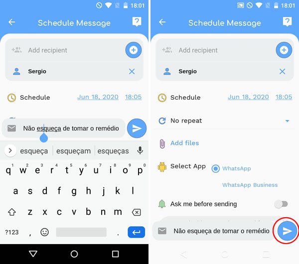 3. Preencha o destinatário, a mensagem e a data e o horário que deseja enviar a mensagem. Você também pode enviar mensagens recorrentes, adicionar arquivos e confirmar o envio da mensagem.