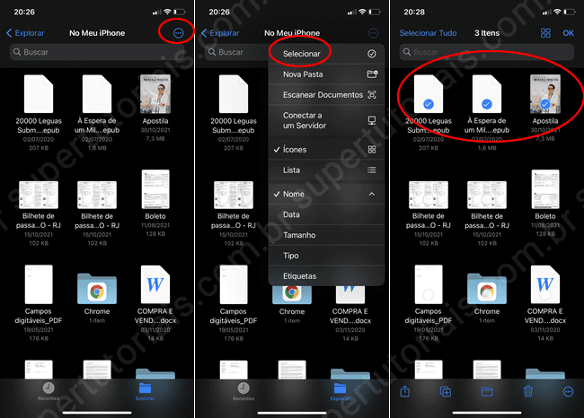 2. Toque no botão de três pontos (…) exibido no canto superior direito da tela, depois em “Selecionar” e por último, marque todos os arquivos e/ou pastas que você deseja compactar dentro do arquivo ZIP.