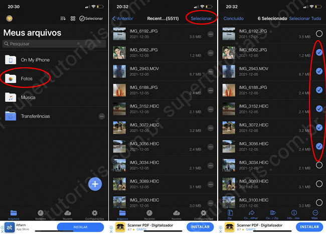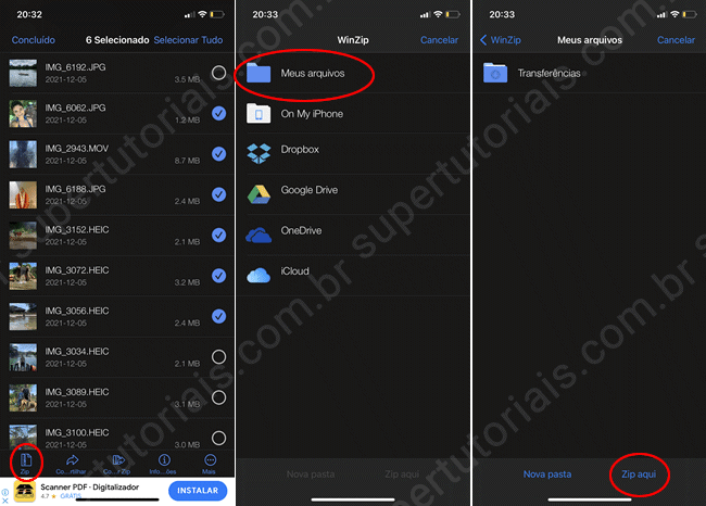 3. Uma vez selecionadas as fotos, toque no botão “ZIP” no menu inferior, selecione a pasta “Meus Arquivos”, toque no botão “zip aqui” no menu inferior, digite um nome para o arquivo e toque em OK.