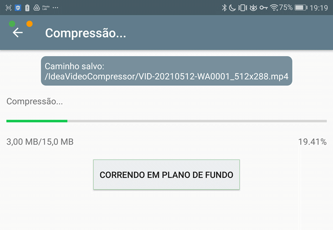 5. Uma vez selecionada uma opção, ele irá iniciar a compactação do vídeo para o tamanho definido. O aplicativo exibe o progresso da conversão com o caminho do vídeo, porcentagem e tamanho final.