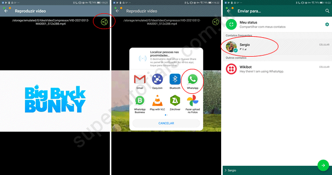 6. Ao final da conversão, o vídeo convertido será reproduzido. Toque no botão de compartilhamento, selecione o WhatsApp na lista de apps e defina para qual contato deseja enviar o vídeo compactado.