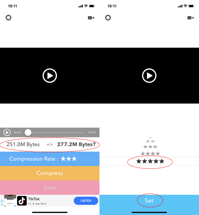 3. O aplicativo irá exibir o tamanho atual do vídeo e tamanho após a compactação. Toque na opção “Compression Rate” e use as “estrelas” para definir o tamanho final do vídeo. Quanto mais estrelas, maior será a compactação. Use as estrelas para definir um tamanho de vídeo até 15 MB ou inferior.