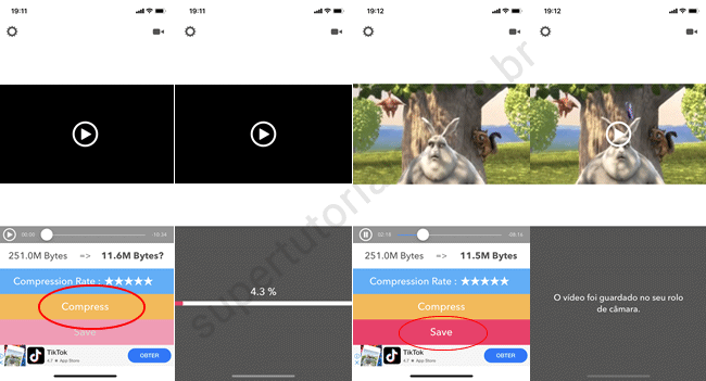4. Toque no botão “Compress” para realizar a compactação. Ao concluir a compactação, você pode assistir o vídeo compactado. Por fim, toque no botão “Save” para salvar o vídeo no “rolo da câmera”.