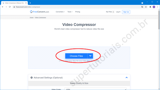 1. Acesse a página de compactação de vídeo do site do FreeConvert, clique no botão “Choose files” e adicione o arquivo de vídeo em seu computador que deseja compactar para enviar no WhatsApp.
