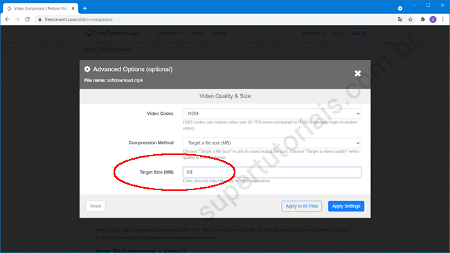 3. Em “Advanced Options”, na opção “Compression method”, selecione “Target a file size (MB) e no campo “Target Size (MB)”, insira um valor inferior a 65 MB, como 63 MB e clique em Apply Settings”.