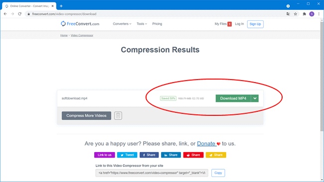 5. Uma vez concluída a compactação, ele lhe mostrará o tamanho final do vídeo e a porcentagem de redução. Basta você clicar no botão de “Download” para baixar o novo arquivo de vídeo compactado.
