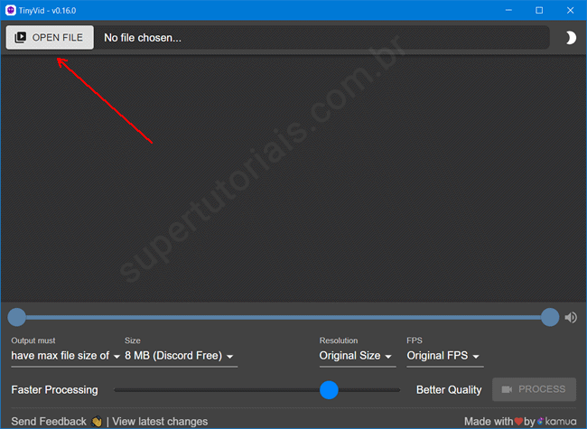 2. Abra o TinyVid, clique no botão “Open File” e adicione o arquivo de vídeo que deseja compactar.