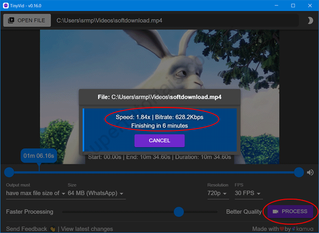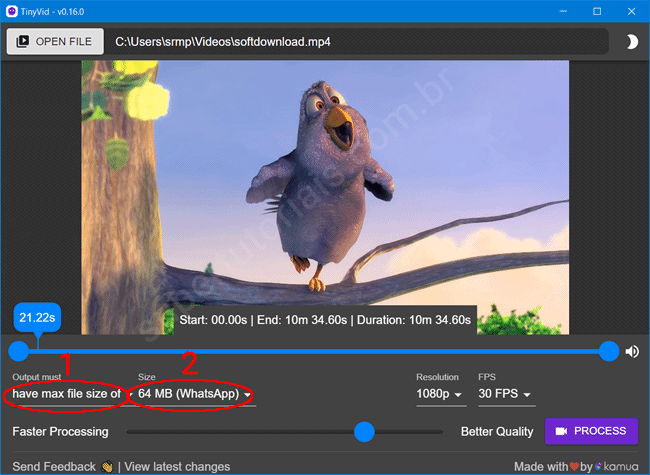 6. Uma vez tudo ajustado, clique em “Process” para compactar o vídeo. Defina o local aonde deseja salvar o vídeo e o processo de compactação será inicializado. O programa exibe na tela o progresso da compactação do vídeo, com informações como velocidade de processamento e o tempo restante.