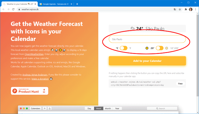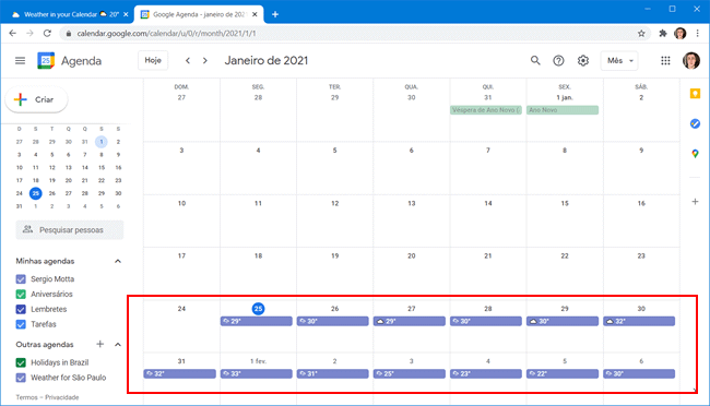 7. Uma vez feito isso, retorne para a agenda do Google e você começará a ver a previsão do tempo em todos os dias do calendário (a partir da data que a previsão do tempo foi adicionada na agenda).