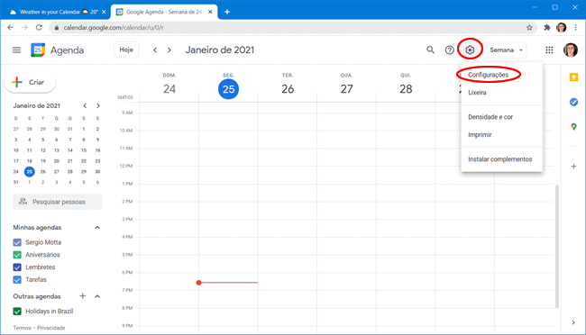 4. No Google Agenda, clique no ícone de engrenagem e depois em “Configurações”.