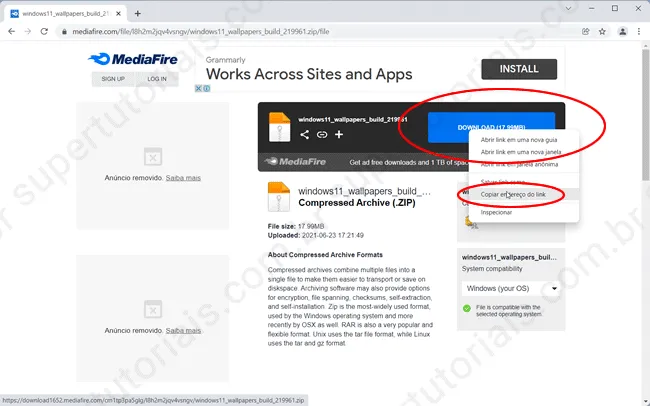 2. Depois de instalado, abra a página de download do arquivo no MediaFire em seu navegador e, em seguida, clique com o botão direito do mouse no botão de download e selecione a opção “Copiar link”.
