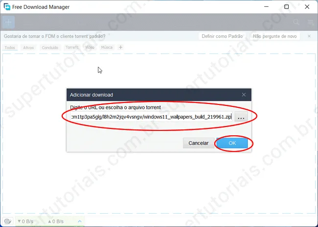 3. Uma vez copiado o link de download do arquivo, abra o programa Free Download Manager, clique no botão (+), cole o link de download do arquivo copiado e clique em “OK” para adicionar o download.