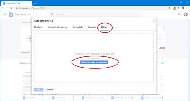 2. Clique na guia “Upload” clique em “Selecionar um arquivo do seu dispositivo” e adicione um dos documentos que deseja comparar. Ao adicionar um arquivo, ele será aberto automaticamente para edição no Google Docs. Retorne a página inicial do Google Docs e adicione o segundo documento.