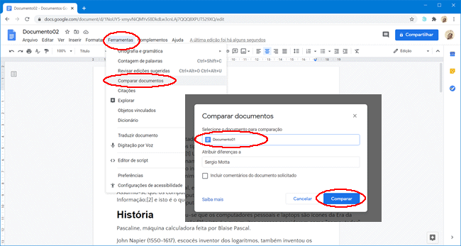 3. Depois de adicionar o segundo documento, ele será aberto para edição no Google Docs. Clique em “Ferramentas > Comparar documentos”, selecione o outro documento e clique em “Comparar”.