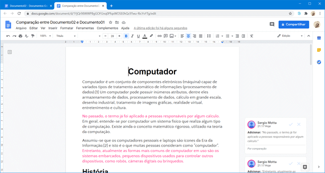 Porém você não precisa fazer isso manualmente, existem ferramentas para comparar documentos automaticamente. Aprenda nesse tutorial como comparar dois documentos usando o Google Docs.