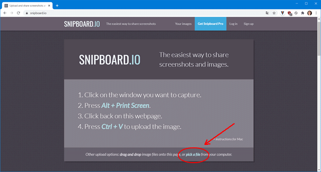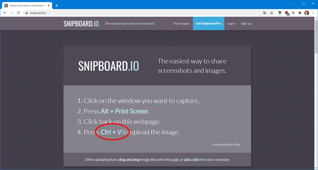 2. Em seguida, acesse o site www.snipboard.io e pressione “Ctrl+V” dentro do site. Ao fazer isso, a imagem será colada na página do Snipboard e salva na nuvem para que você possa compartilhá-la.