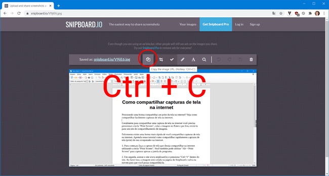 3. Você pode simplesmente copiar o link de compartilhamento da imagem pressionando “Ctrl+C” ou então, clicar no primeiro botão da barra de ferramentas do Snipboard para copiar o link da imagem.