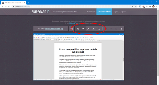 4. Opcionalmente, você pode editar a imagem capturada antes de compartilhá-la na internet, como por exemplo, recortar a imagem capturada, desenhar na imagem usando um lápis e adicionar texto.