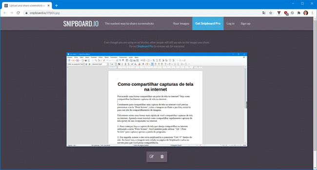 6. Por último, basta enviar o link de compartilhamento da imagem para quem precisa recebê-la e ao abrir o link compartilhado, ela irá visualizar a imagem que você compartilhou no site do Snipboard.
