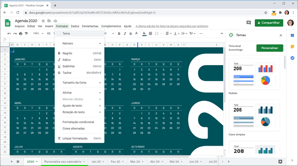 4. Em seguida, você pode personalizar o modelo, como por exemplo, trocar a cor da fonte e a cor de fundo. Clique em “Formatar > Tema > Personalizar” e ajuste as cores ou então selecione outro tema.