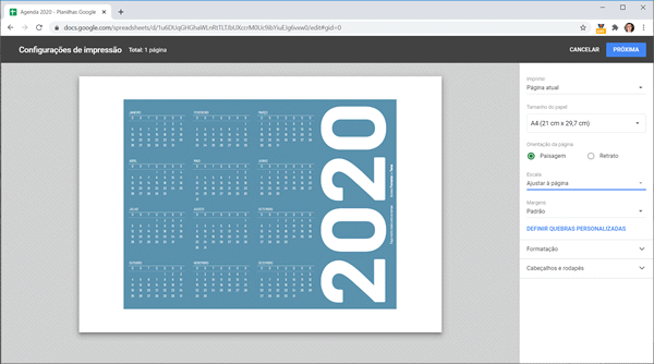 5. Por último, clique no menu “Arquivo > Imprimir” para imprimir o calendário. Se o calendário estiver ocupando mais de uma página, você pode selecionar a opção “Ajustar a página” no item “Escala”.