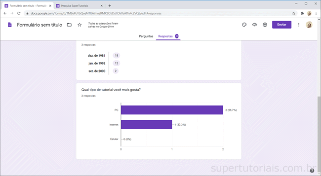 11. Você pode verificar as respostas dos usuários a partir da guia “Respostas” no menu superior. Ele oferece opção de criar uma planilha com as respostas e receber notificações de respostas por email.