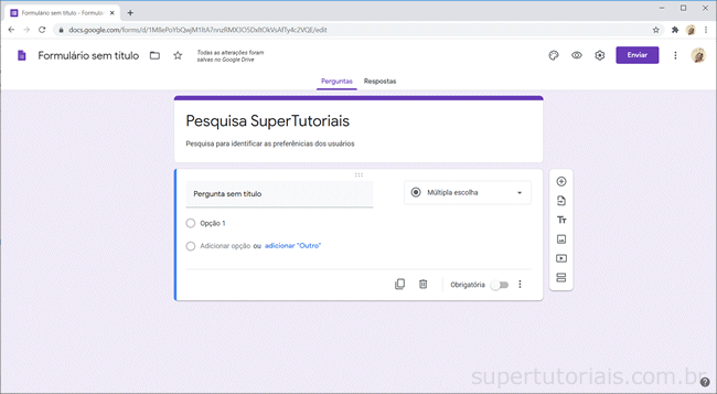 4. Em seguida, para adicionar sua primeira pergunta, clique em “Pergunta sem título”, digite um título para a pergunta e defina as outras opções, como tipo (multipla escolha, resposta, caixa de seleção). Além disso, você também pode duplicar a pergunta, deletá-la e marcar a pergunta como obrigatória.