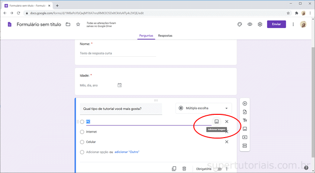 6. Nas perguntas de múltipla escolha você pode adicionar uma imagem em cada resposta. Clique no ícone de imagem ao lado da resposta e adicione a imagem. Repita a operação nas outras respostas.