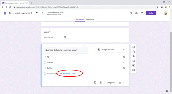 7. Ainda nas perguntas de múltipla escolha, você pode adicionar um campo de texto para as pessoas digitarem outra resposta. Clique em “adicionar outro” e ele adicionará o campo Outros no formulário.