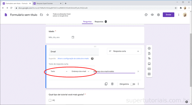 8. Um outro recurso interessante é a validação de resposta. Por exemplo, você pode verificar se um endereço de email digitado é valido. Adicione a pergunta, clique no botão de três pontos, e marque a opção “Validaçao de resposta”. Em seguida, selecione o tipo “Texto” e escolha “Endereço de e-mail”.