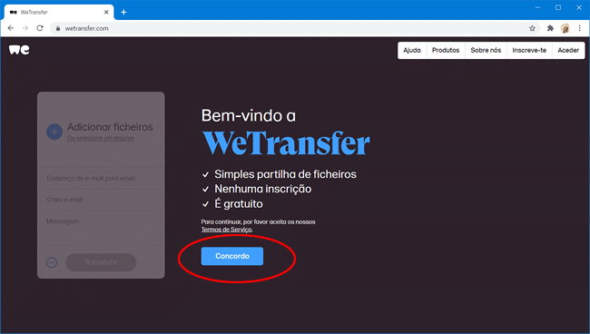 1. Para começar, acesse o site do WeTransfer e clique em “Concordo” e “Aceito”.