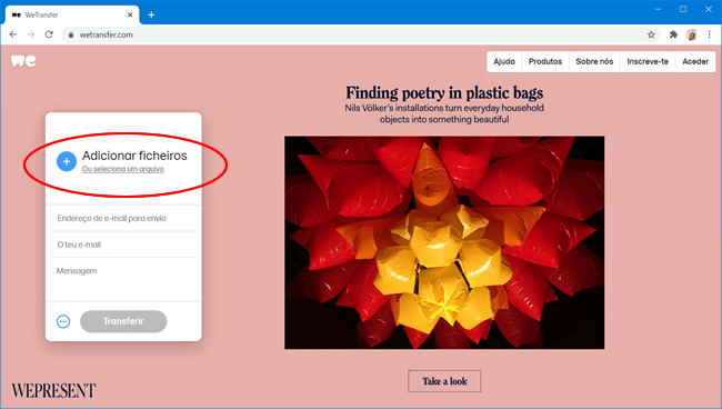 2. Uma vez feito isso, clique em “Adicionar ficheiros” e selecione em seu computador o arquivo que deseja enviar para outra pessoa. O WeTransfer permite enviar arquivos de até 2GB gratuitamente.