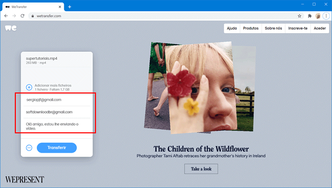 3. Em seguida, digite o endereço de email da pessoa para quem você deseja enviar o arquivo, o seu endereço de email e opcionalmente uma mensagem para a pessoa que irá baixar o arquivo enviado.