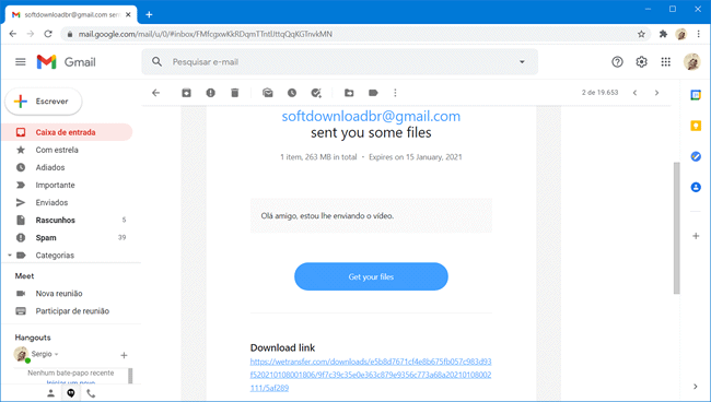 6. Uma vez concluído o upload do arquivo, o destinatário receberá um email com o link para baixar o arquivo. Tudo o que ele precisará fazer é clicar nesse link para fazer o download do arquivo enviado.