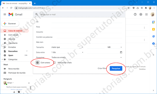 3. Na janela aberta, marque a opção “Com anexo” e clique no botão “Pesquisar” para filtrar os emails. Opcionalmente, você também pode digitar has:attachment na caixa de pesquisa e pressionar “Enter”.