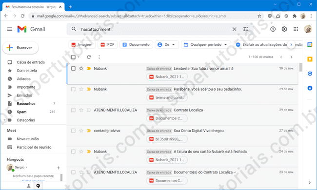 4. Uma vez feito isso, o Gmail irá listar todos os emails em sua conta que possuem arquivos anexos.