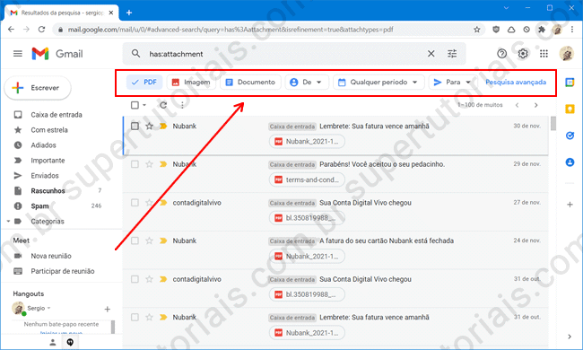 5. É possível filtrar ainda mais a busca por tipo de arquivo, remetente, destinatário, período ou então, usar a “pesquisa avançada” para adicionar outros filtros, como assunto, tamanho, conteúdo e outros.