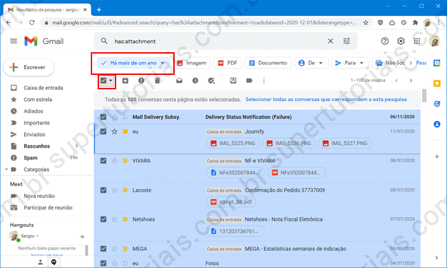 6. Se o seu objetivo for liberar espaço, você pode, por exemplo, selecionar um “período” mais antigo, como “há mais de um ano” e deletar todos os e-mails com arquivos anexos que tem mais de um ano.