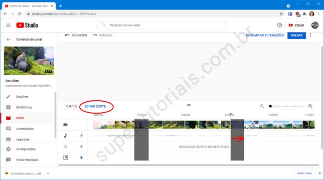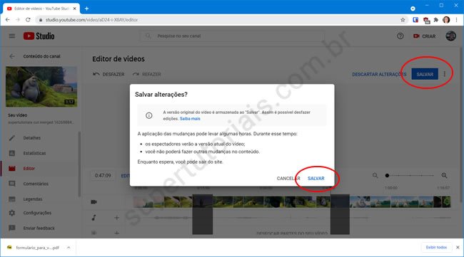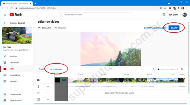 3. Se quiser fazer mais ajustes, clique no botão “Editar corte”. Porém se estiver tudo certo, clique em “Salvar”, confirme a edição clicando em “Salvar” novamente e aguarde o vídeo ser processado.