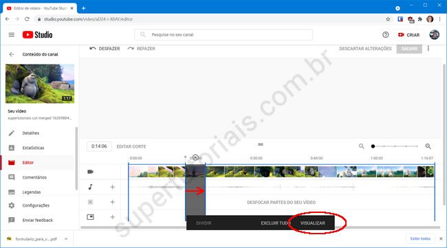 1. Clique na ferramenta “CORTAR” e você verá uma barra azul nas duas extremidades do vídeo. Arraste a barra azul até o ponto do vídeo que deseja manter e depois, clique na opção “Visualizar”.