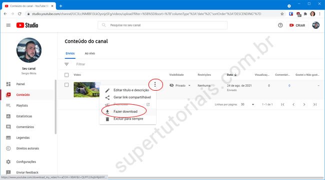 7. Você verá na guia “Conteúdo”, o video editado. Clique no botão com “três pontos” e selecione a opção “Fazer download” para baixar o vídeo. Após baixar o vídeo, você pode deletá-lo do Youtube.