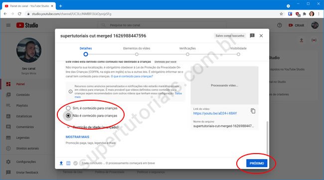 4. Marque a opção “Não é conteúdo para crianças” e clique em “Próximo”.