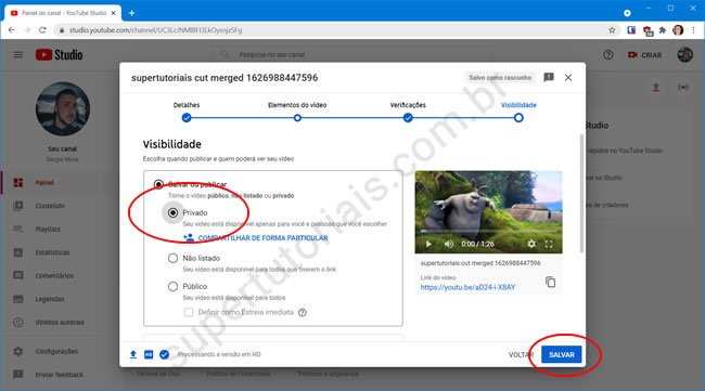 6. Clique em “Salvar”, depois clique na opção “Conteúdo” na barra lateral para ver os vídeos em sua conta e aguarde o vídeo ser processado. Uma vez processado, clique na miniatura do vídeo.