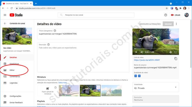 7. Clique na opção “Editor” na barra lateral para abrir o editor de vídeo do Youtube.