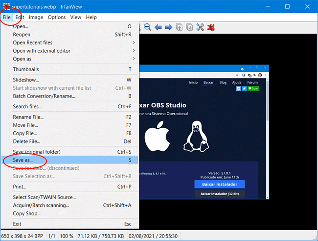 3. Uma vez carregada a imagem WebP no IrfanView, clique no menu “File > Save as..” e selecione em qual formato deseja salvar a imagem. É possível salvá-la em vários formatos como o PNG e JPG.