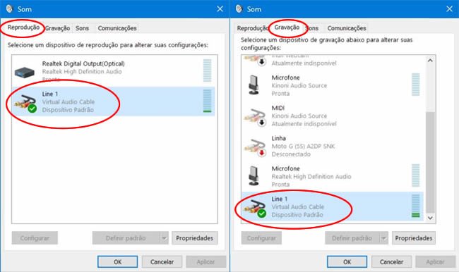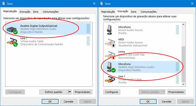 3. Na guia “Reprodução”, verifique se o “Line 1″ está definido como padrão. Caso não esteja, clique nele para selecioná-lo e depois clique no botão “Definir padrão”. Faça o mesmo na guia “Gravação”.