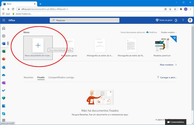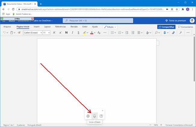 7. Retorne a página do Word online e clique no “botão de microfone” na parte inferior da página para iniciar a transcrição. Outra opção é usar a tecla de atalho Alt + ‘ (aspas simples) para ativar o ditado.